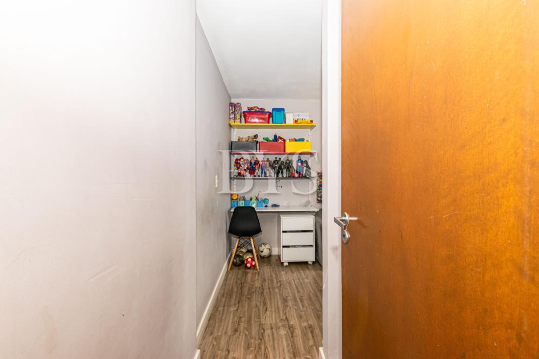 Apartamento com sala de estar e sala de jantar, num ambiente integrado, teto com gesso rebaixado e luzes embutidas, rack. 3 quartos. Banheiro reformado com box blindex, chuveiro elétrico, armários planejados, cozinha e lavanderia com armários planejados. Piso laminado. Garagem coberta, nº 23. Posição: Lateral.